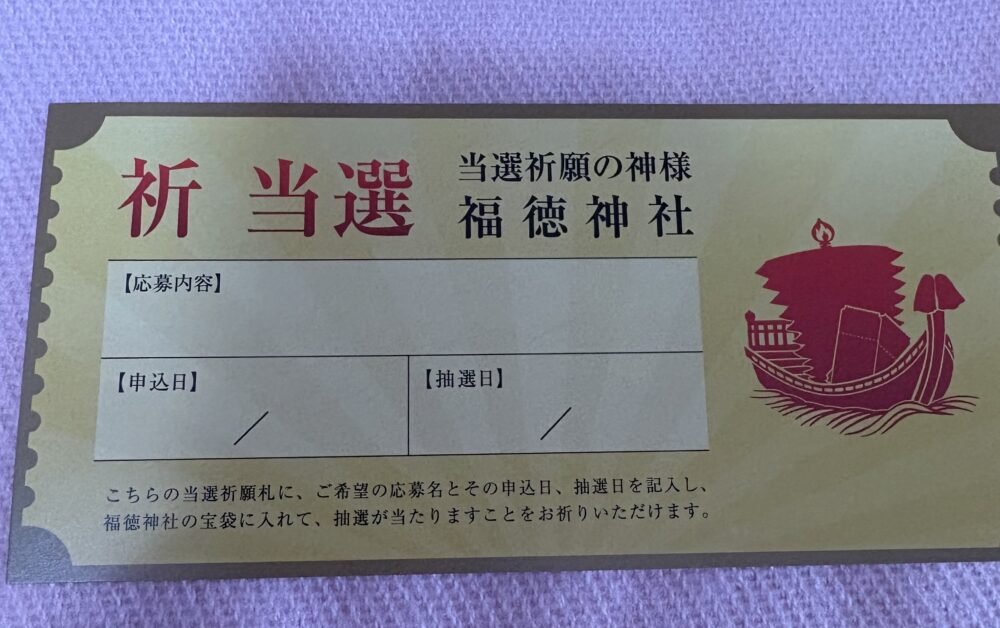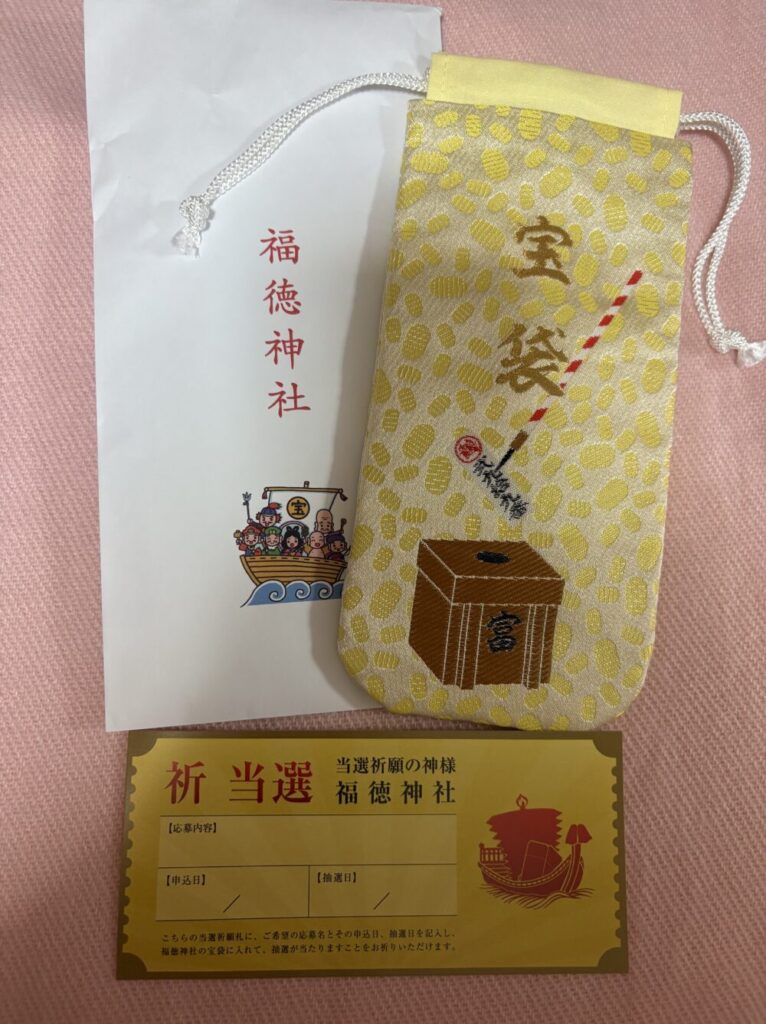ちなみに、宝袋の中には「当選祈願の神様 福徳神社」と書かれた金色の当選祈願札も入っていました。
