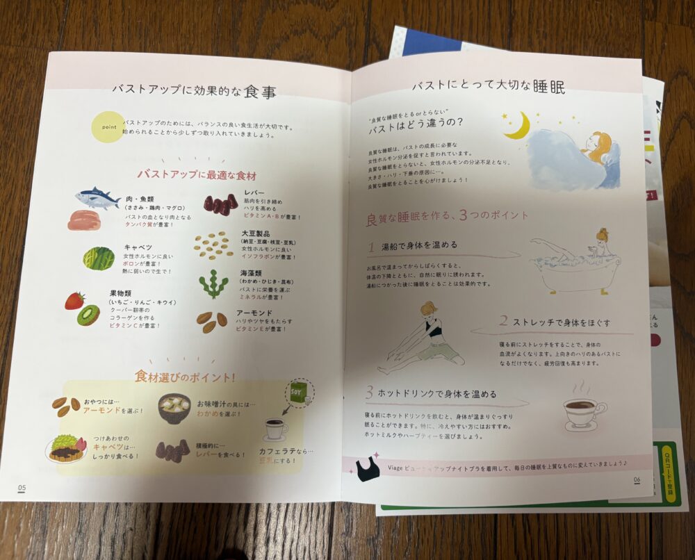 ブラと一緒に届いた小冊子には、バストケアに役立つ栄養素や生活習慣のアドバイスなどがイラスト付きで丁寧に紹介されていました✨