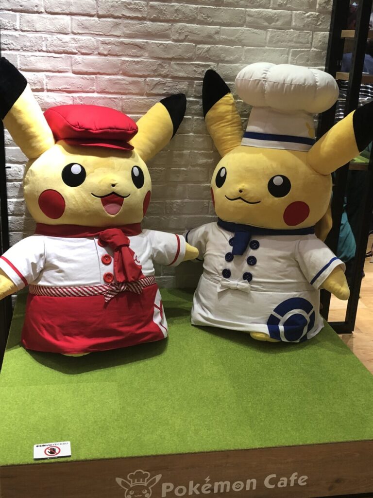 店内には、コックさん姿のピカチュウたちの大きなぬいぐるみや、歴代デザインのポスターが飾られていて、どこを見てもポケモンだらけの空間でした。