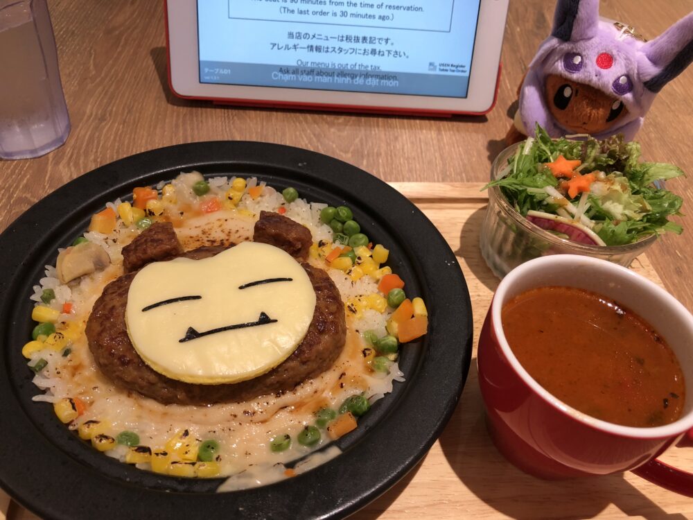 とろっとしたチーズドリアの上に、どーんとカビゴンのハンバーグがのっていてボリューム満点! ハンバーグもしっかりジューシーで、ドリアとの相性も抜群でした。セットのスープも優しい味で、ほっと一息つける一品です。