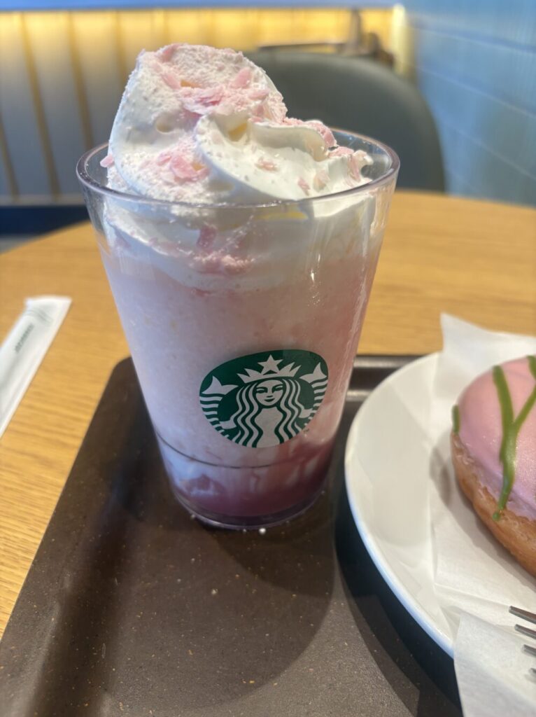 見た目も、下の方に桃色がグラデーションになっていて、上にはたっぷりホイップと桜トッピング。