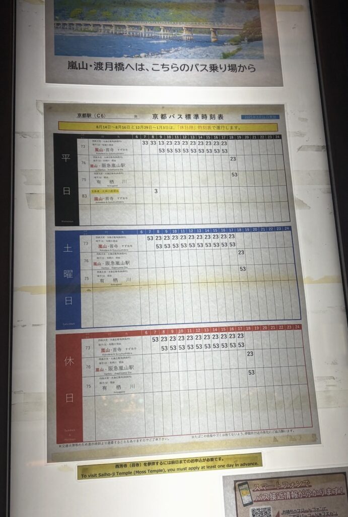 私は今回、京都駅のバス乗り場C6から73系統のバスに乗って鈴虫寺へ向かいました。