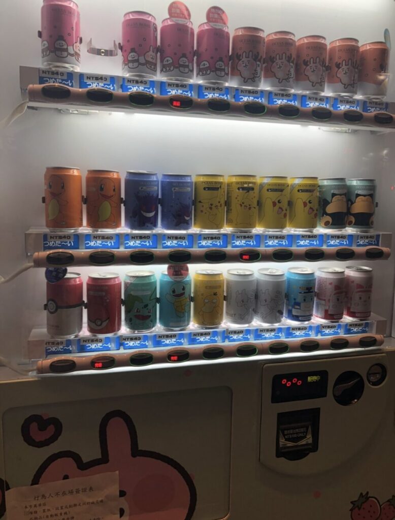 さらに、キャラクター缶がずらっと並んだ可愛い自販機も発見。