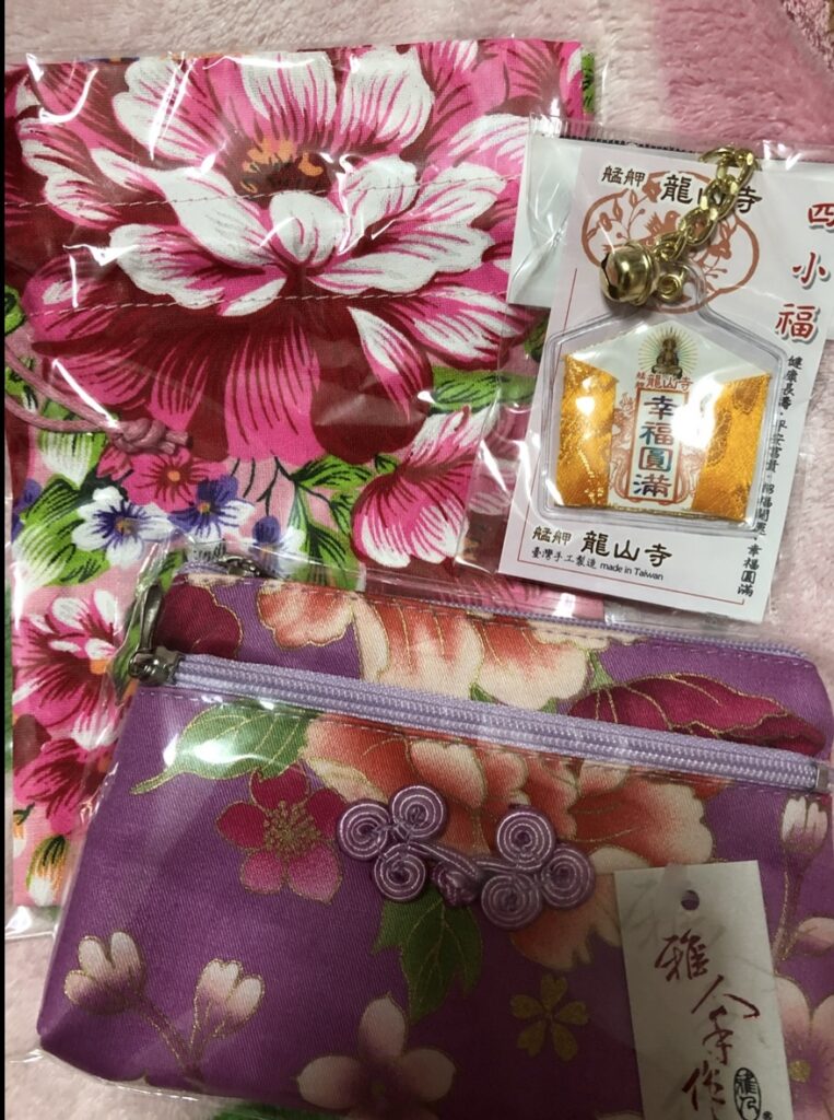 最後にご紹介するのは、花柄の布「花布」を使ったポーチと、龍山寺でいただいたお守りです。